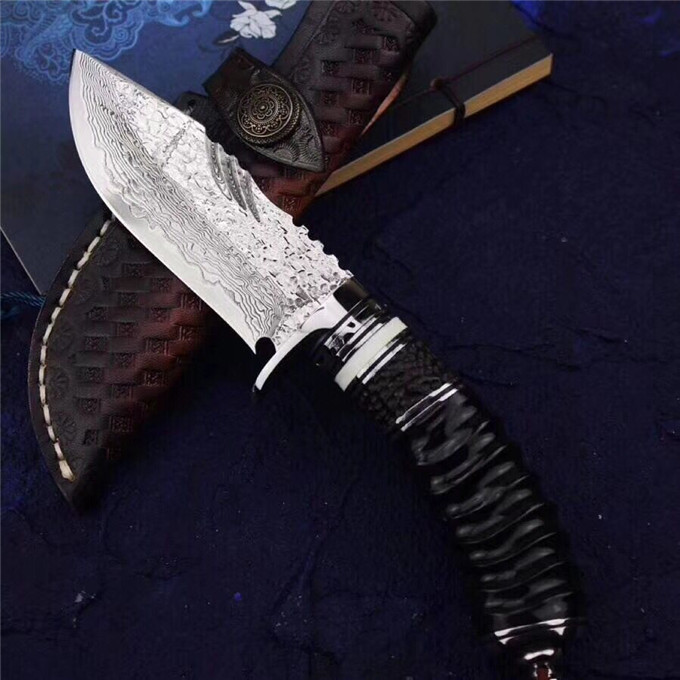 刀选用大马士革钢制刃,表面原大马士革祥云花纹独特个性[色],柄部精选老料黄羊角+黑檀木料纯手工雕微粒纹,不仅防滑既显高档大气,3.5mm钢刃厚度,韧性很强悍,锋利耐用型(手工缝制复古牛皮刀套)