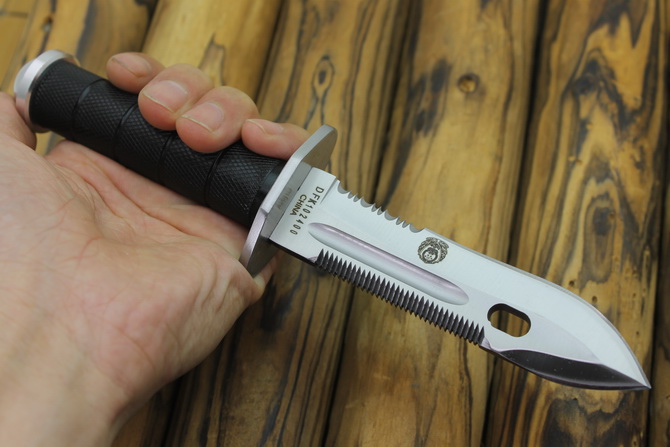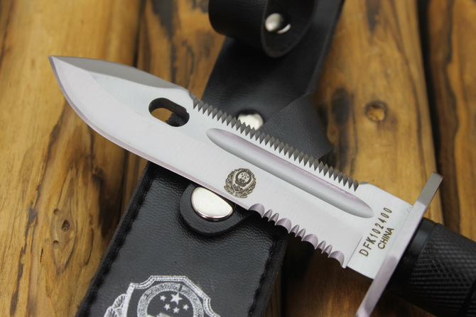 精仿迷你警用FK-1制式刀 型号:每一把有独特的流水号 全长:21cm 刃长:10cm 刃宽:2.5cm(最宽处) 柄长:10.5cm 刃材:440 硬度:57 表面:平磨砂光 刃厚:0.5cm 柄材:ABS工程硬胶(表面喷橡塑,手感舒适) 重量:250克 其他:刃口锋利,手柄尾部有玻璃撞针,真皮刀套