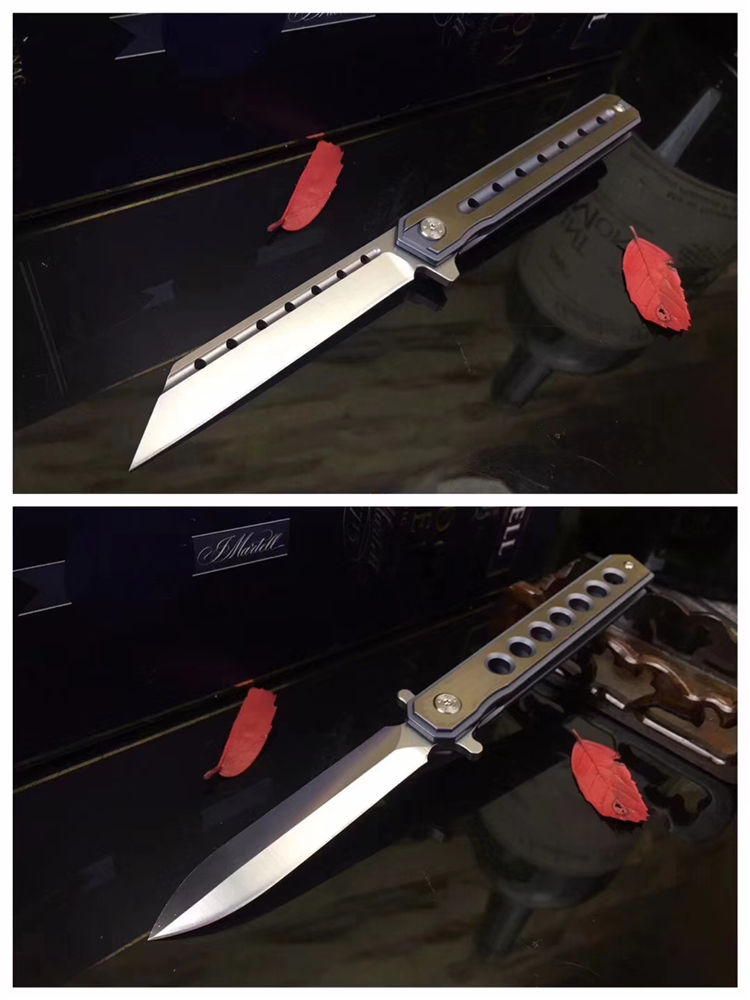 潜龙D2钛合金折刀 全长:21.5cm 刃长:9.5cm 刃宽:1.5cm(最宽处) 柄长:12cm 刃材:D2 柄材: TC4钛合金 硬度:59-61HRC 净重:95克 刃厚:0.4CM 利度:锋利 功能:家用、野外露营 包装:原装纸盒 适用范围:户外