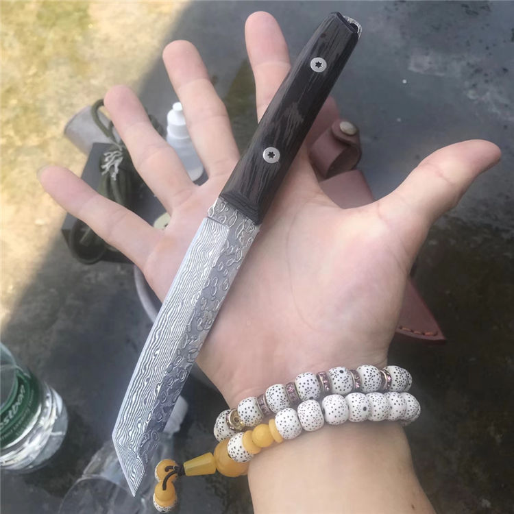 鸡翅木手柄可随意拆卸,还可以Diy加铜护手防滑绳缠绕手柄,满足Diy发烧友,把玩骨灰级宝贝噢,该刀彩用顶级大马士革钢重本打造,锻打雨滴水波花纹朵朵饱满,进口鸡翅木镶大马士革龙骨一体手柄,资深老师傅纯手工打磨,刀刃经过高温热处理工艺二次开刃,特别锋利,能轻易括毛剃胡子削纸过水瓶轻松搞定,是收藏送礼户外狩猎把玩馈赠亲友之精品,喜欢快来