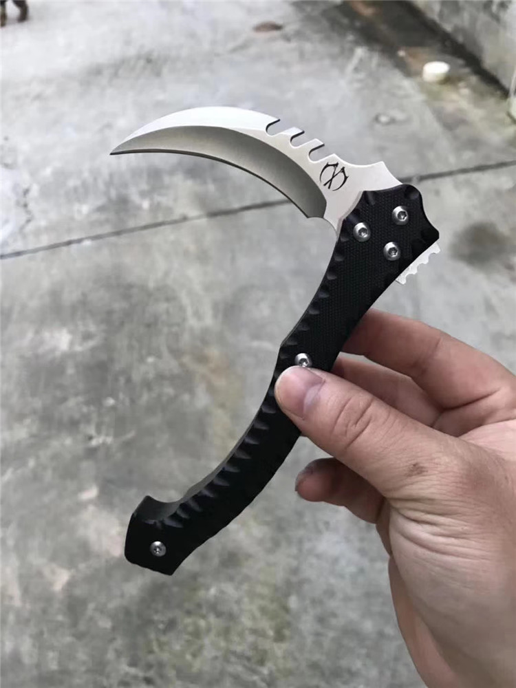 新款开山魔镰刀 刃长:75mm 刃宽:25mm 刃厚:4.5mm 材料:440c不锈钢 硬度:58 柄长:160mm 柄厚:16mm 柄宽:最窄处16,最宽处28 手柄:黑色格纹G10 cnc 表面:加工 搭配细纹2.0厚材料k板K鞘 钢原色表面加工哑光,配礼品盒! EDC拍照背景实物好帮手,别有一番风味