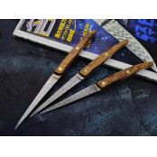 一款独特外形性飞鱼刀,刀身选材螺旋纹大马士革钢,柄部选取(花梨木材)梅花柳钉固定、是一款非常不错的作品,纯手工开刃、非常锋利无比