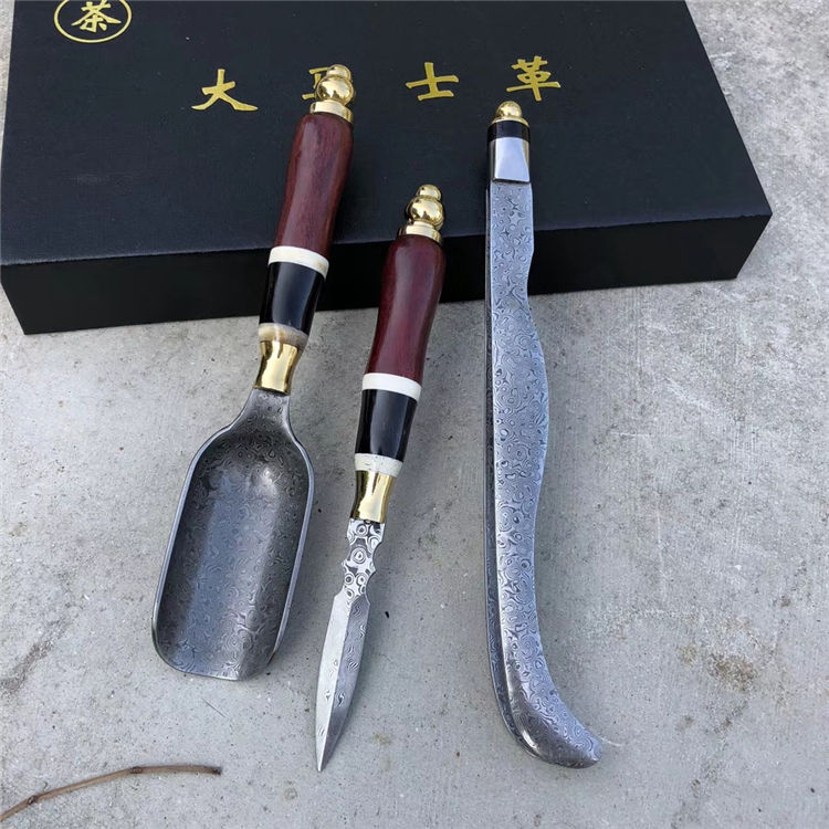 聚客大马士革三件套装茶刀 茶针总长:16cm 刃长6.5cm 刃厚2.5mm 茶勺总长:17cm 勺钢长8cm 厚度:2mm 茶夹总长:18cm 厚度:2mm 钢材:大马士革钢 硬度:59HRC 表面:大马士革原纹 包装配置:高级礼品硬盒