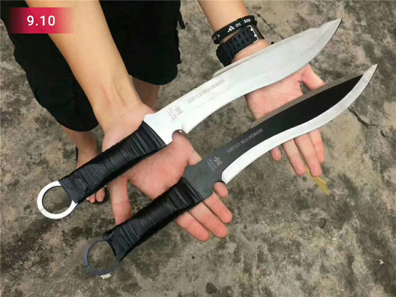 KHK激战战刀 全长:50cm 刃长:35cm 最宽处:4.8cm 厚:0.4cm 重约:0.6kg 刃材:高锰材质 硬度:60