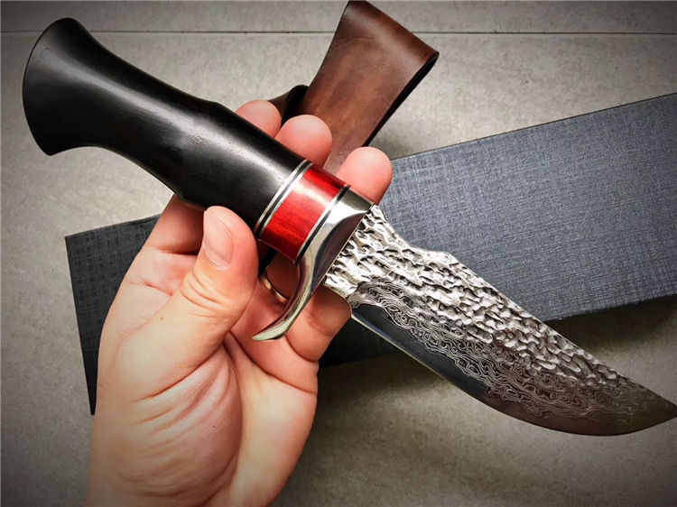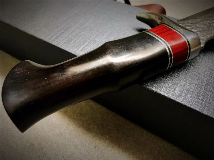 整体设计简洁明了。采用vg10刃钢大马士革,自锻祥云花纹,表面保留原锻凹凸不平,手工抛光,刀刃拇指按压位采用手工打磨圆孤,按压不刮手。手柄不锈钢护手+科檀+黑檀木,经手工打磨抛光后,手感非常舒适,使用得心应手。搭配意大利A级植鞣牛皮皮套