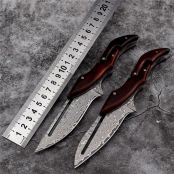 2019最新款大马士革蚂蟥机械折刀 类型:中型折刀 全长:190mm 刃长:105mm 刃宽:25-33mm 厚度:3.3mm 材料:大马Vg10 硬度:钢芯硬度60-61 手柄:黄檀木手柄 锁定:机械锁 刃口:锋利表面 独特的造型,创新的操作方式,打破传统构思,令人焕然一新 开刀:刀柄尾端的三角部分可以象活动夹子一样,用手指稍用力一夹,即可将刀刃打开(看附图) 关刀:同样压住刀柄三角尾部,即可将刀刃收起(看附图)