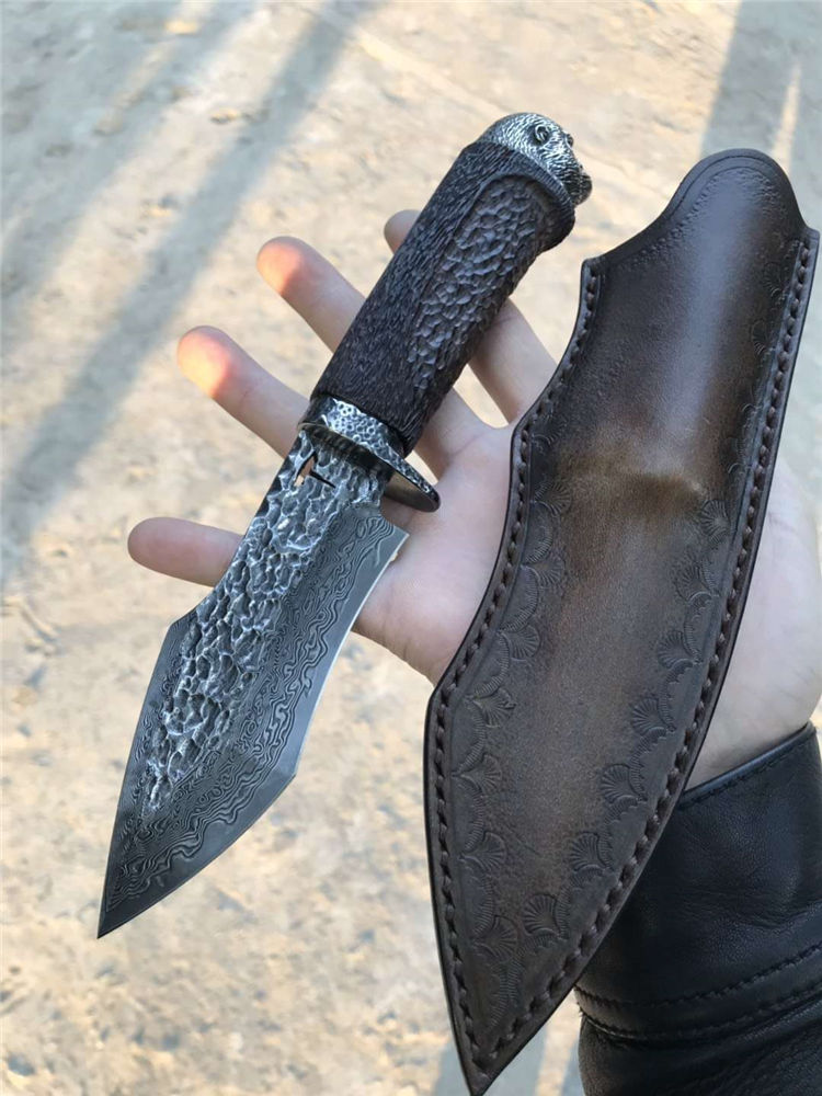 表面工艺:怀旧沧桑复古黑工艺,保留锻打锤纹,刀尾镶嵌金刚钢头、可以当求生锤子敲打工具,