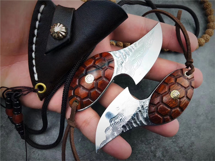 95层进口锻造大马士革VG10钢打造,真空深冷热处理,硬度58-60HRC,优点:极其锋利度出色,韧性锋利保持度非常稳定。刀柄雕刻龟甲纹,寓意富甲天下一把个性十足的香刀,配置纯手工缝制头层牛皮刀套,可作配饰吊坠刀。喜欢的友友们不可错过