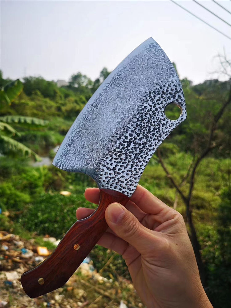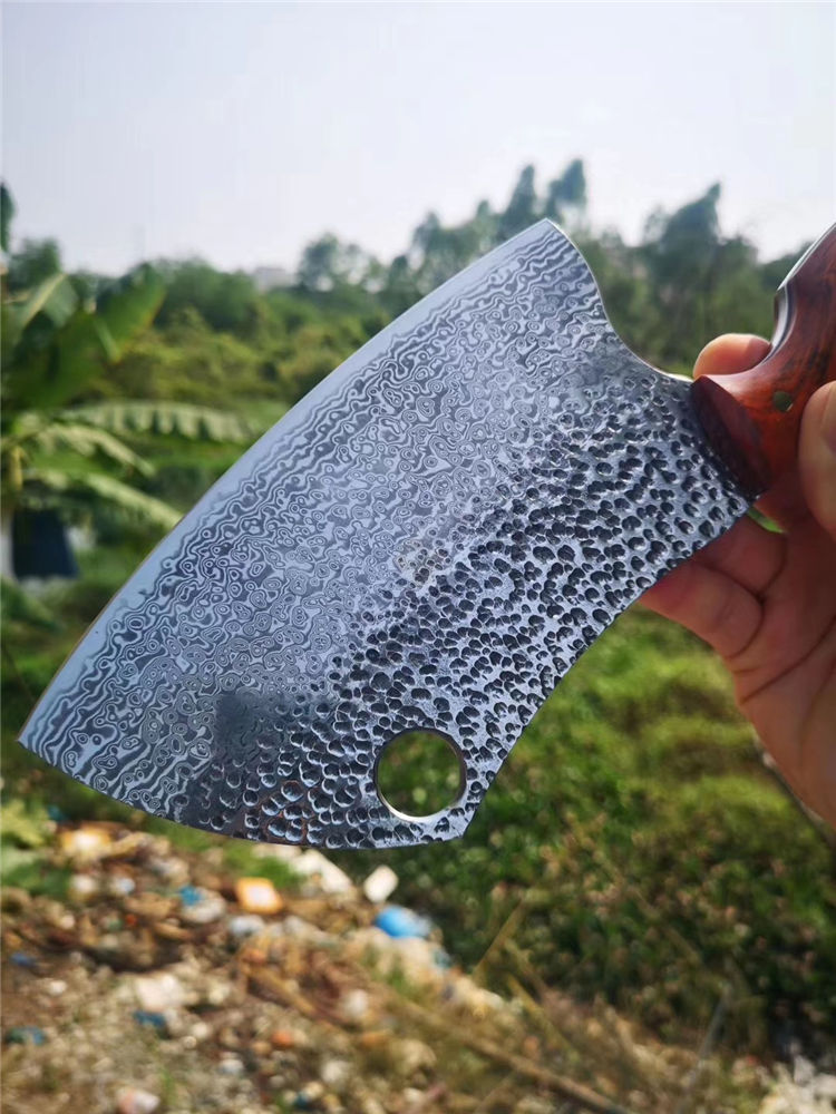 大马士革猛牛砍骨厨刀 总长:300mm 刃长:180mm 刃厚:4.5mm 刃宽:95mm 净重:525克 硬度:60—61HRC 包装:手工黑色盒子包装 日本进口VG10钢芯锻造大马士革钢97层,真空深冷油淬热处理,锋利度级别:国际一级锋利标准,食品级安全检查,柄材;进口黄檀木嵌片,三颗黄铜铆钉固定