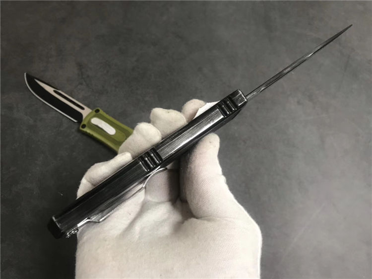 MICROTECH微技术857鬼直出跳刀 类型:直出弹簧刀 品牌:MICROTECH微技术 开启长度:23.4CM 合起长度:13.3CM 刃长:9.8cm 刃厚:2.9CM 硬度:57 HRC 刃材:440 表面:刀刃发黑伴拉丝 把手: 锌铝合金 净重:300克(整刀) 毛重:450克(含包装物) 开合:双动作,直推开关,自动弹出和收回 包装:耐磨专用战术尼龙套 口袋刀夹:弹簧刀夹 玻璃敲击器:钨质玻璃敲击器