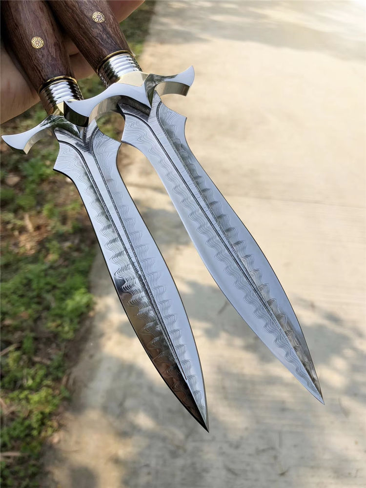 大马士革索亚魔刃神剑直刀 总长:29.5cm 刃长:15cm 柄长:14cm 刃宽:3.8cm 刃厚:3.9mm 硬度:60-61HRC、真空深冷热处理,纯手工多道开锋,极其锋利无比 柄材:一体成型王者钢头挡手+镶嵌黄铜+进口疤花瘤木+马赛克铆钉 皮套:阿根廷进口植鞣皮纯手工雕花镶嵌蛇皮刀套,复古怀旧风格 包装:高级手工黑色盒+皮套+保养刀油