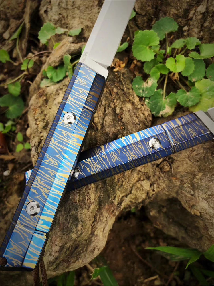 M390蓝妖武者直刀 总长:20cm 刃长:9.3cm 刃宽:1.7cm 刃厚:3.2mm 重量:105G(裸刀) 钢材:奥地利M390 硬度:60-62HRC,真空深冷热处理 结构:一体龙骨钢材结构 开刃方式:水冷多次开刃 柄材:TC4钛合金特殊烤蓝工艺 皮套:头层牛皮套纯手工缝线 包装:复古手工盒子包装 武士刀头和水滴刀头两种选择