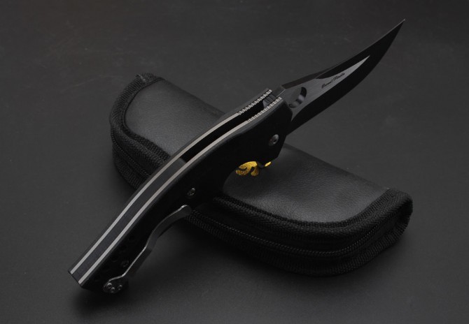 蜘蛛C196轴承快开折刀 总长:23cm 刃长:9.5cm 刃厚:4mm 刃材:CPMS30V 刃面处理:镀钛 手柄材质:G10 系统:滚珠轴承系统 硬度:58HRC 重量:260克