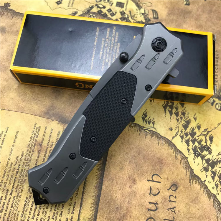 勃朗宁F126快开折刀 总长:23cm 刃长:9cm 柄长:14cm 刃宽:2.5cm(最宽处) 刃厚:2.7mm 刃材:5CR13MOV 硬度:56HRC 刀柄:钢头+黑色G10柄 表面:灰钛 重量:250克含包装配原厂包装