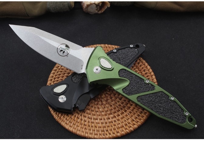 微技术猎豹侧开跳刀 全长:234mm 刃长:98毫米 刃厚:4毫米 材料:vg10 硬度:58-60hrc 柄材:航空铝合金6061+石英贴片 螺丝、夹子:420不锈钢 净重155g