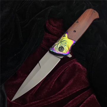 全长:22.5cm 刃长:9cm 柄长:13cm 刃宽:2cm 刃厚:2.5mm 刃材:3Cr13Mov 重量:200g(含包装) 硬度:56HRC 表面:拉丝 柄材:全钢镭射刻花+彩木 锁型:内衬锁 包装:纸盒