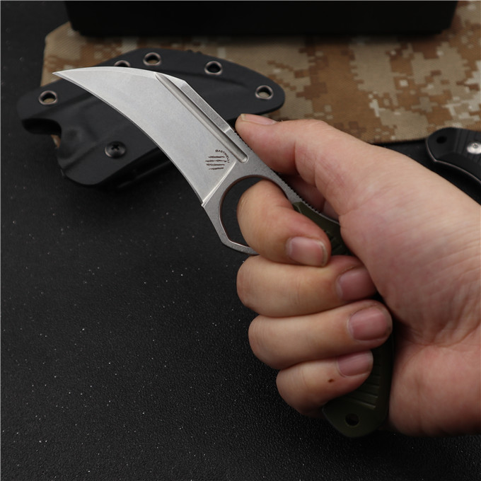 巴斯哈皮战术爪刀 全长:18.3CM 刃长:7.5CM 刃厚:0.5CM 刀柄:8.7CM 刃宽:2.6CM 钢材:DC53 硬度:59-60HRC(真空油冷热处理) 表面:沧桑石洗或石洗 刀柄:黑色G10 刀套:K鞘 净重:116(刀重) 重量:240g(含包装) 包装:黑色礼品盒.