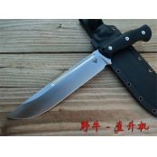 野牛直升机直刀 全长:380MM 刃长:245MM 刃材:DC53 热处理:真空油淬,回火3次 硬度:60-61HRC 表面处理:精细砂光,数控v磨,再手工精磨 刃厚:6.7MM 刃宽:46MM 柄材:G10 柄长:135MM,一体龙骨,内部锣感重,重心调整完美 刀鞘:进口k鞘 刀净重:约580克(不包括刀鞘)