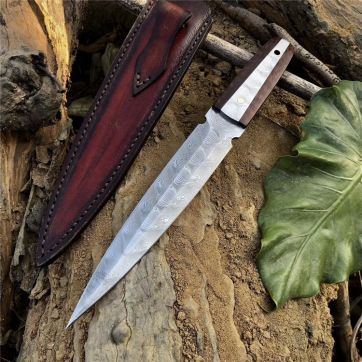 大马士革眼镜蛇直刀 全长:27.8cm 刃长:17cm 柄长:9.5cm 刃厚:0.35cm 刃材: VG10无心大马士革 热处理: 真空深冷热处理 硬度:60HRC 柄材:蛇纹木+大马士革 净重:278g 毛重:385g 配:手工高档皮套