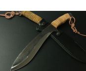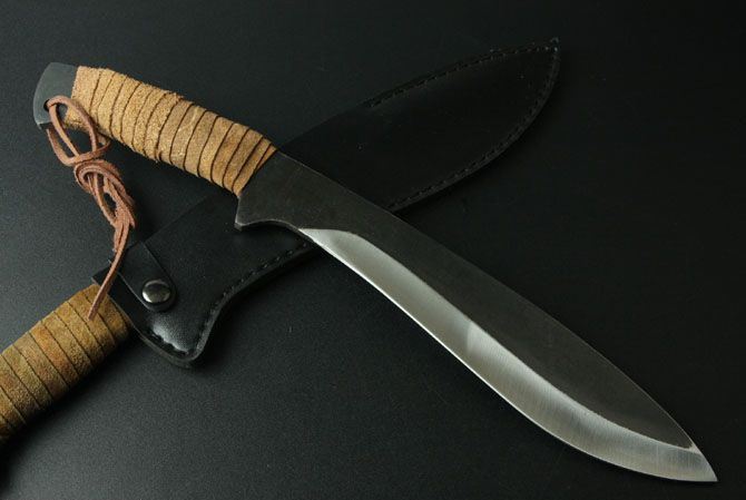 全 长:43cm 刃 长:24cm 柄 长:13cm 刃 厚:7mm 刃 宽:5.5cm 净 重:810克 毛 重:880克(含包装物) 硬 度:60HRC 刃 材:碳钢 柄 材:扎皮 表面处理:钢本色