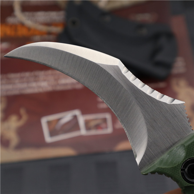 D2钢鹰嘴型爪刀 品牌:挺进者 全长:18.2cm 刃长:8.5cm 柄长:10.5cm 刃宽:3.4cm 刃厚:0.5cm 刃材:D2 重量:190g(单刀) 硬度:60--61HRC(真空油冷热处理) 表面:砂光拉丝和沧桑石洗 柄材:军绿色或黑色G10 其他:配k鞘和礼品盒