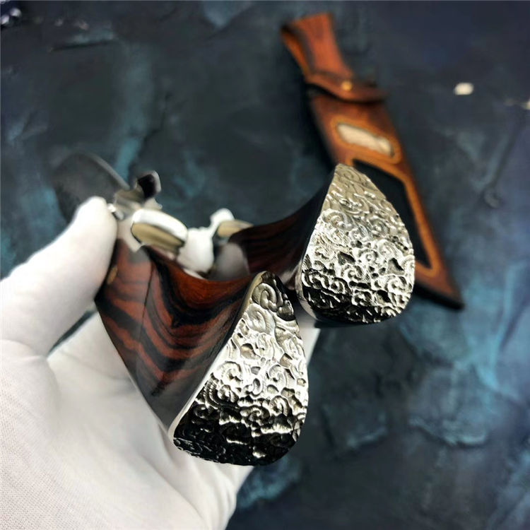 大马士革匠魂直刀 总长:28cm 刃长:15cm 手柄:12.5cm 宽:3.5cm 厚度:4mm 钢材:进口锻造大马士革钢 硬度:60HRC,真空高温热处理 柄材:不锈钢头雕刻腾云图腾+进口美国沙铁木 皮套:进口植鞣皮纯手工制作镶嵌蛇皮刀套 包装:黑色手工盒+皮套