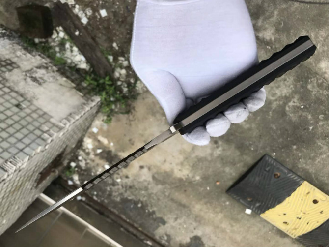 挺进者BT纪念版直刀 全长:32.5cm 刃长:16.7cm 柄长:13.5cm 刃厚:6mm 刃宽:3.6cm 钢材:DC53 硬度:60-61HRC 热处理:BOS专业真空热处理油淬 表面处理:精幼打磨钢本色效果 柄材:黑色复合G10材质 K鞘:进口K版+植鞣皮做旧效果 产地:中国代工