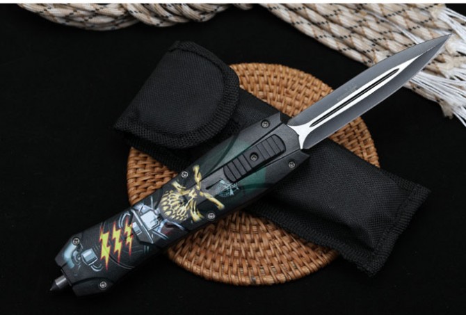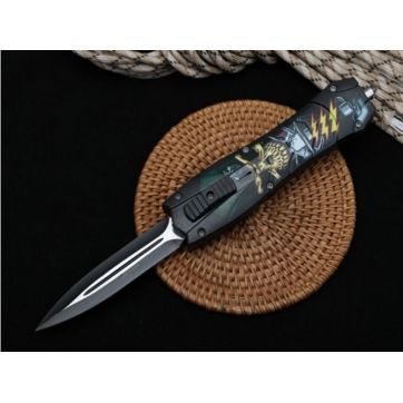 复仇者直出跳刀 全长:23cm 刃长:93mm 柄长:138mm 刃宽:18mm 刃厚:2.2mm 刃材:5Cr13Mov 硬度:57HRC 表面:拉丝+黑钛 柄材:ABS 锁型:直出