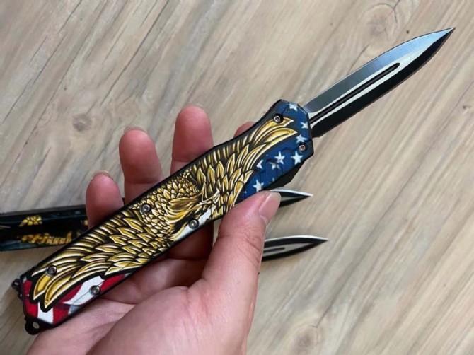 迷彩版暗码天启直出跳刀 总长度:248mm 刀片长度:100mm 刀片厚度:2mm 刀片宽度:20mm 手柄长度:140mm 手柄厚度:12mm 刀片材质:5CR13 硬度:57 表面处理3D打印