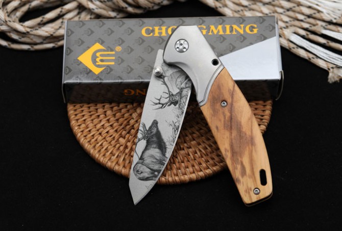 创名CM98快开折刀 刃长:8.8cm 柄长:11.5cm 刃宽:2.4cm 刃厚:3.2mm 刃材:440 重量:172(含包装) 硬度:57HRC 表面:3D打图, 柄材:钢片+天然橄榄木柄,木纹清晰。 锁型:线锁 其他:配厂盒